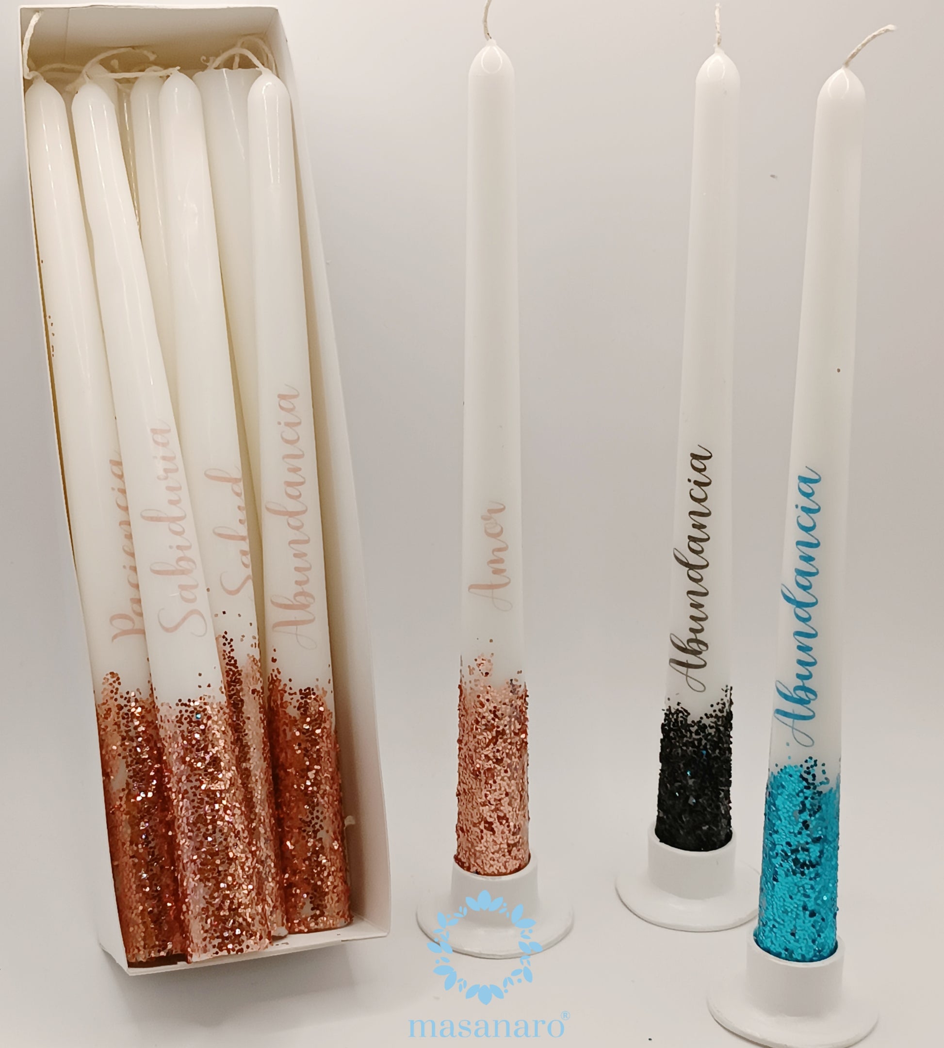 Paquete con 12 velas de los deseos. Disponible en color Dorado, turquesa y champagne
