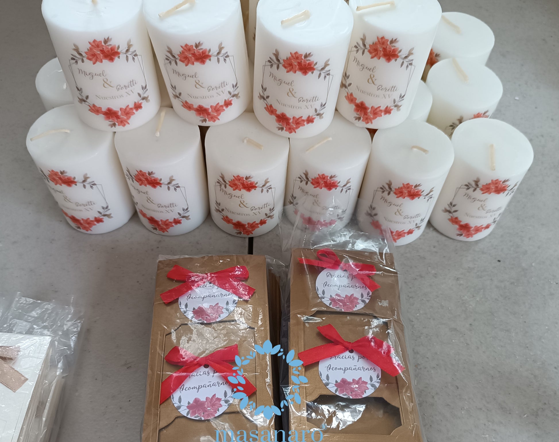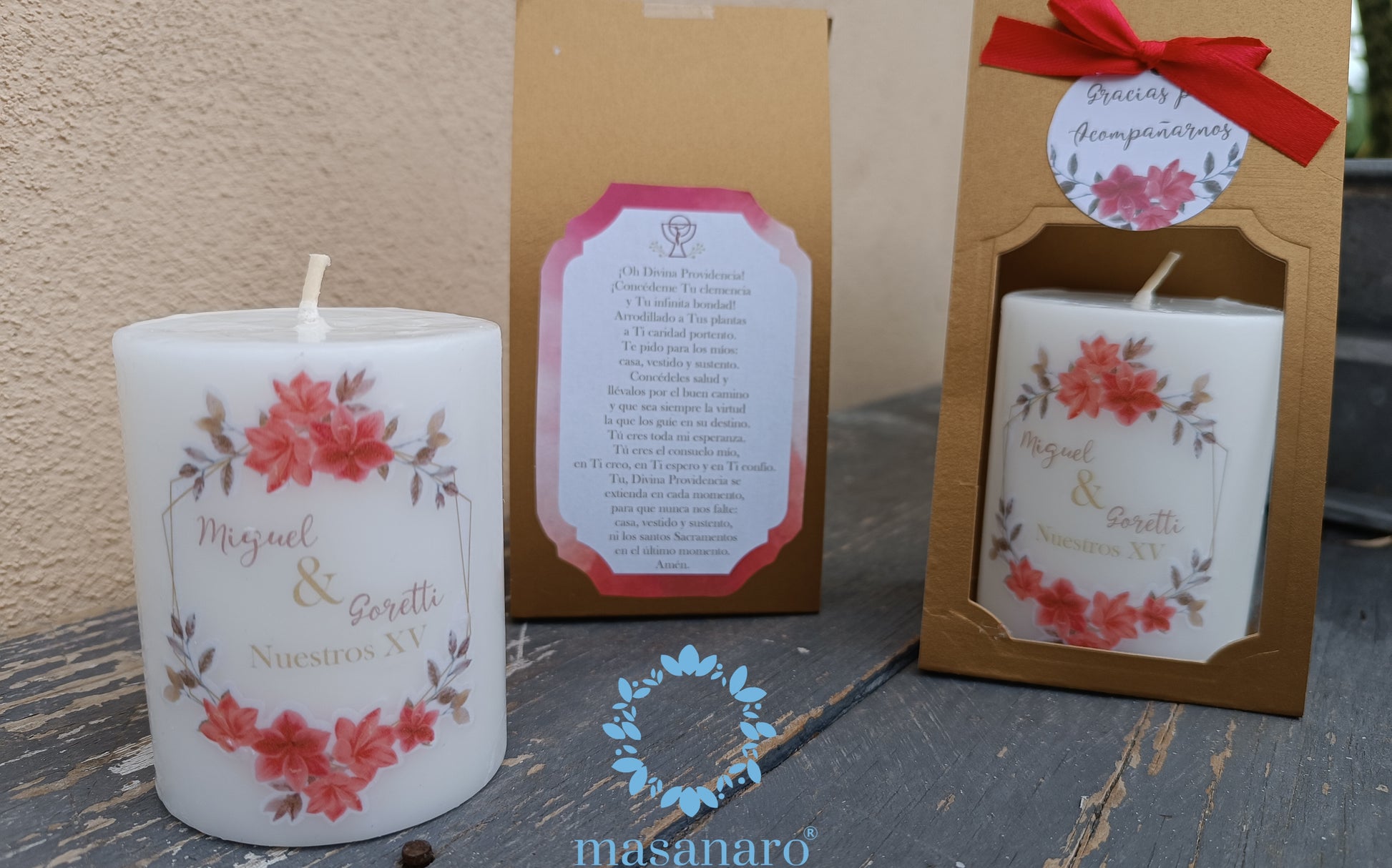 Vela con empaque de cartón. Diseño borde hojas doradas XV años