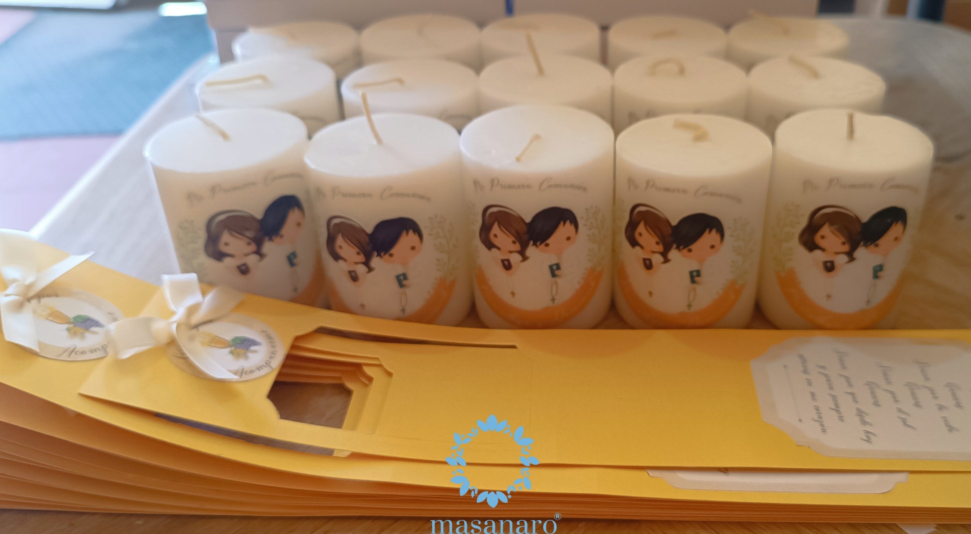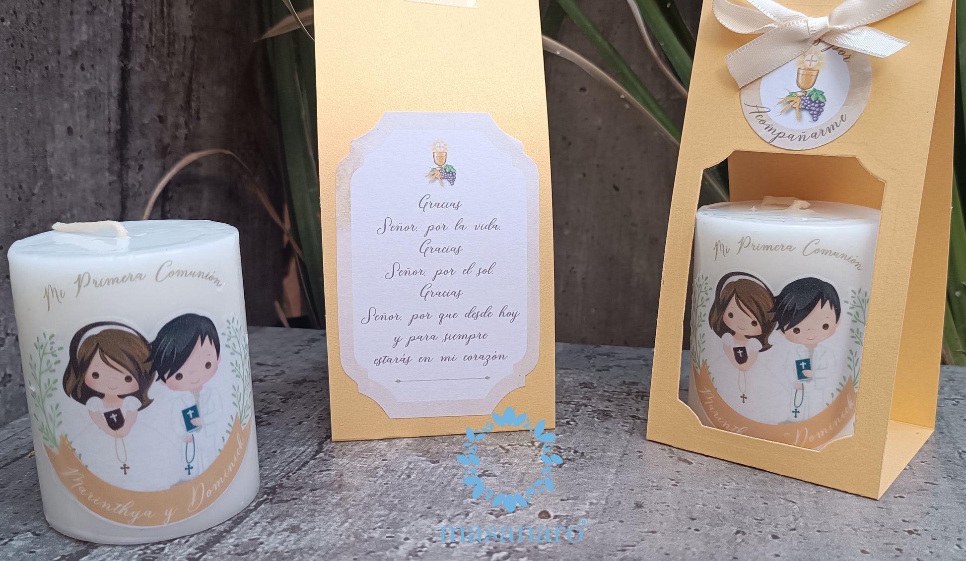 Vela con empaque de cartón. Diseño niña y niño olivo