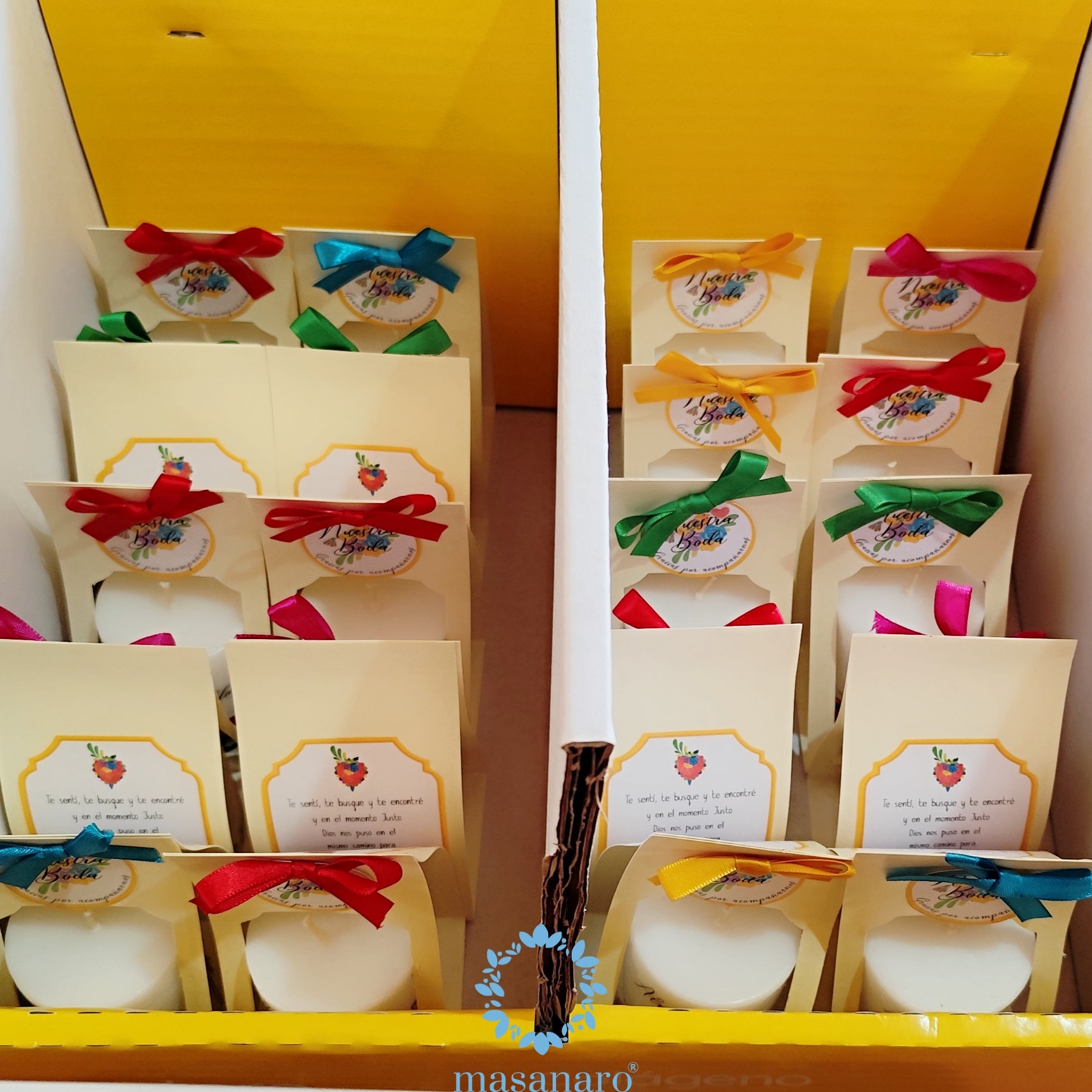 Vela con empaque de cartón. Diseño novios en auto rojo