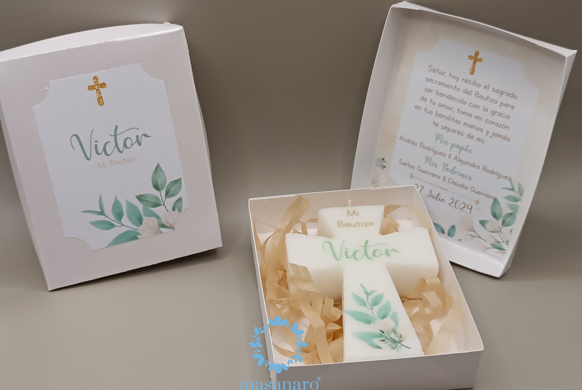 Vela de cruz con caja de cartón. Diseño hojas verdes