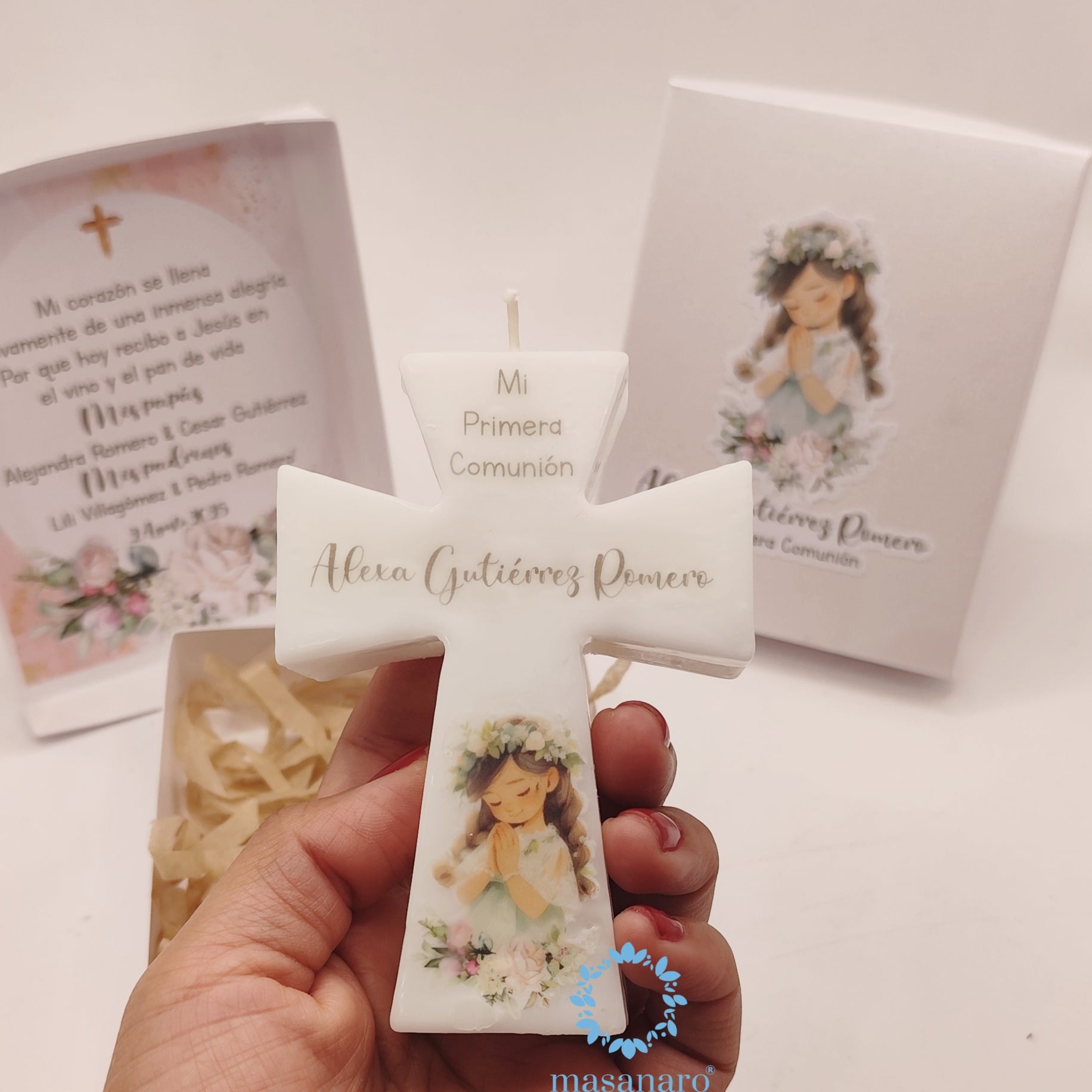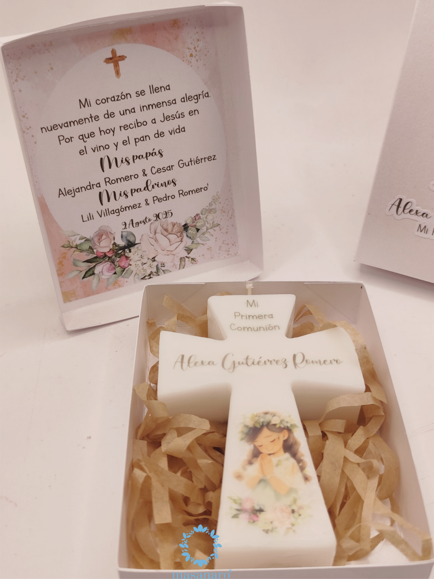 Vela de cruz en caja de cartón. Diseño muñequita con flores vintage