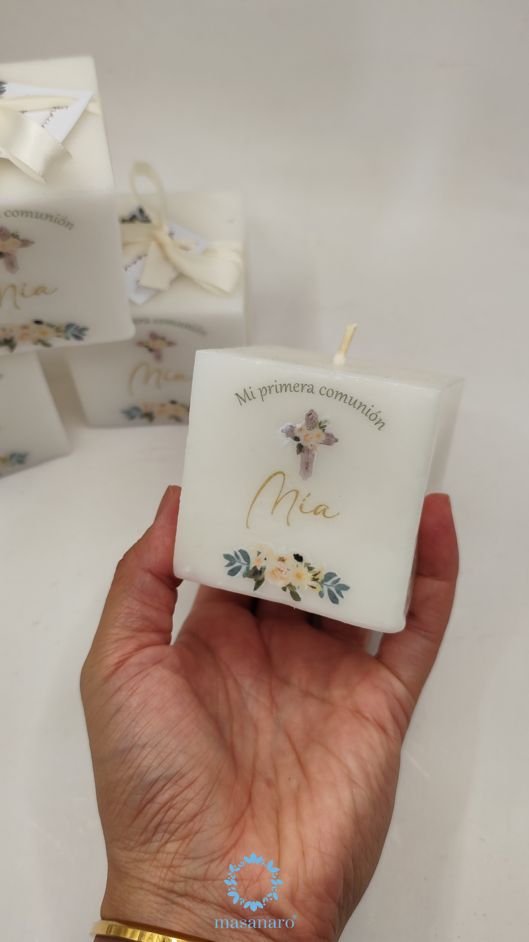 Vela cubo. Diseño flores blancas y cruz de madera