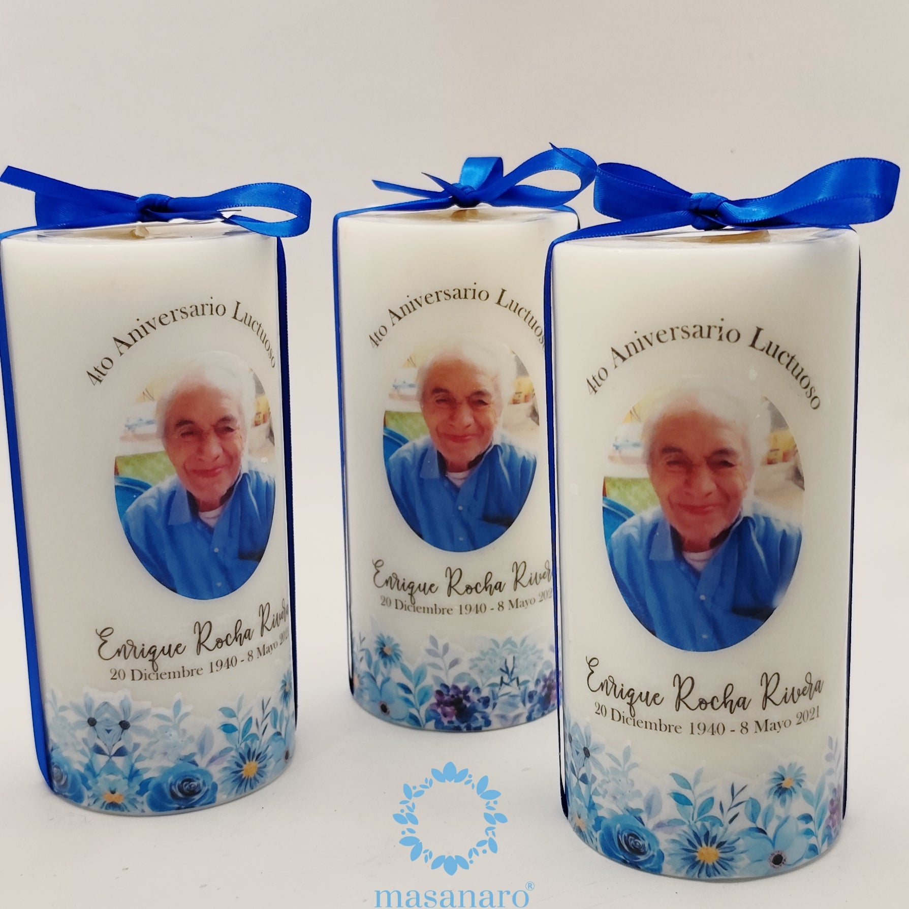 Vela con diseño flores azules y foto