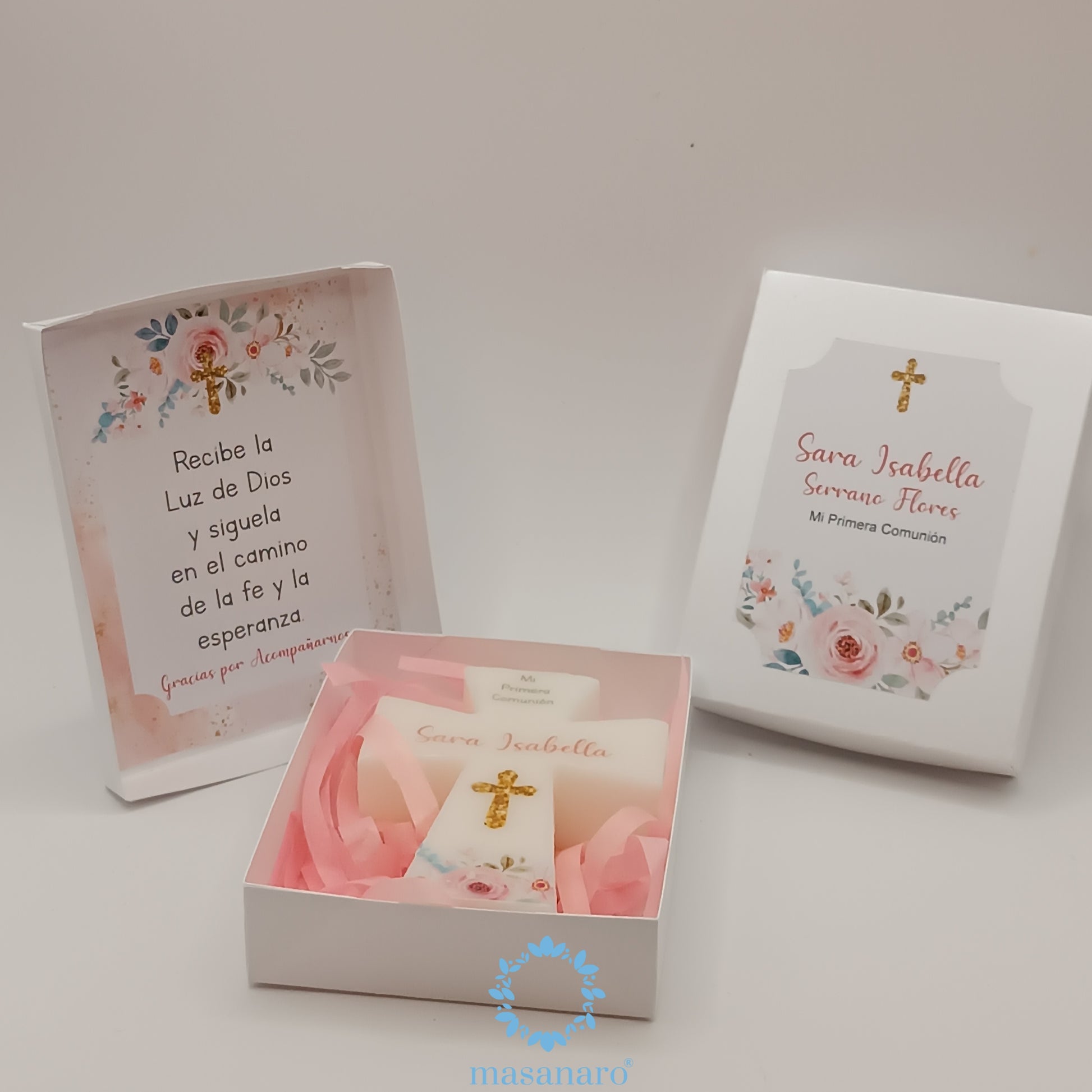 Vela de cruz en caja de cartón. Diseño flores rosas