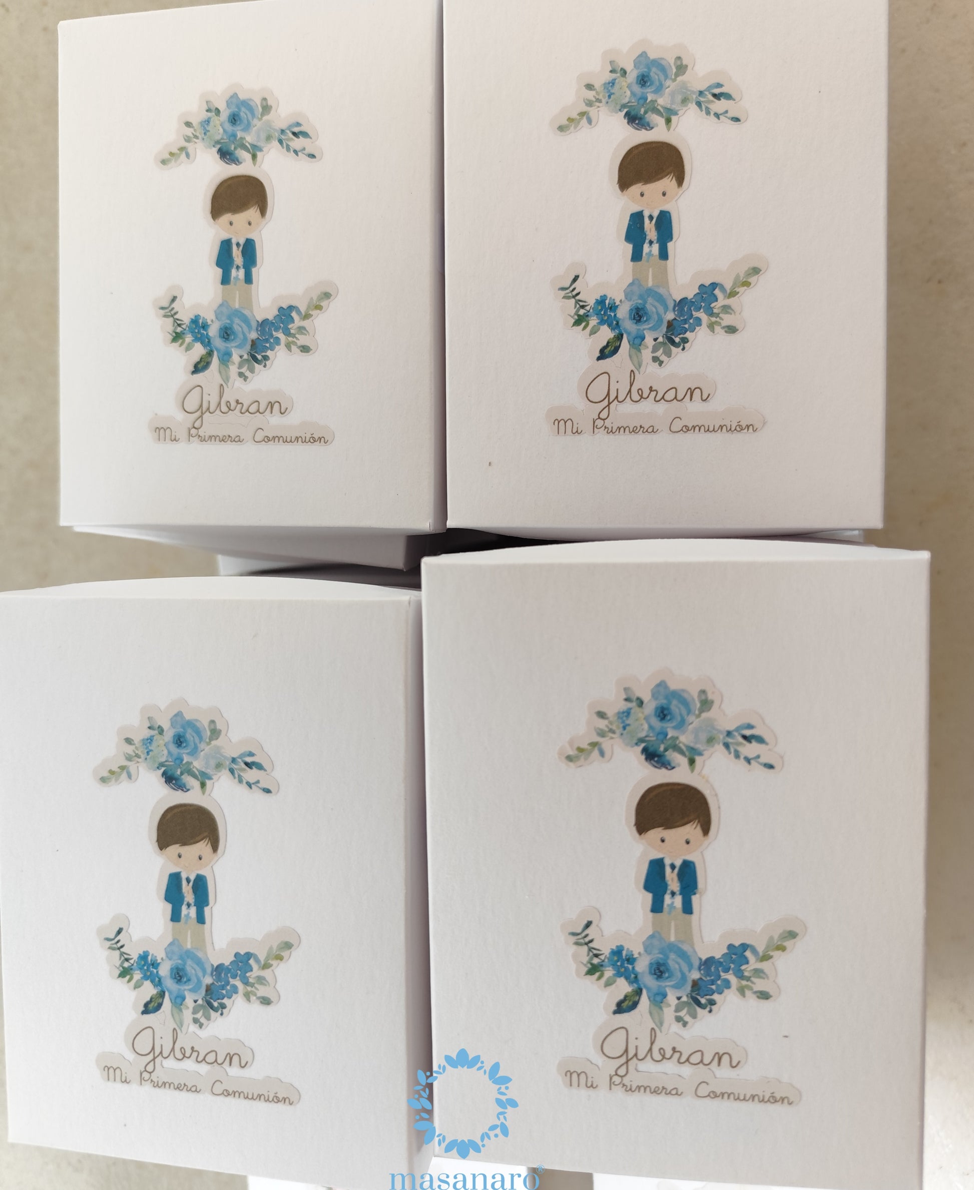 Vela de cruz en caja de cartón. Diseño Niño con flores azules